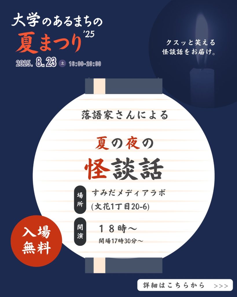 落語家さんによる「クスっと笑える怪談話」をお届けします! 開演時間;18:00〜(開場 17:30) 会場:すみだメディアラボ ◼︎入場無料 落語が初めての方も大歓迎! この夏、涼しくて不思議な夜を一緒に楽しみませんか? |